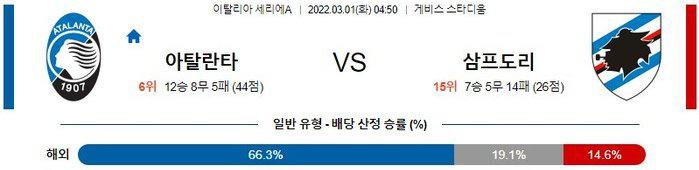 【세리에A】 3월 1일 아탈란타 vs 삼프도리아