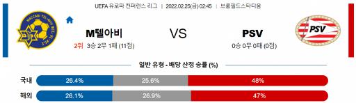 유로파리그 2월 25일 02:45 마카비 텔아비브 : PSV 에인트호번
