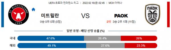 【UEFA 유로파 컨퍼런스리그】 2월18일 FC 미트윌란vs PAOK FC