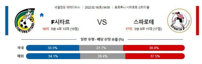 시타르트의 우세를 점치겠다. 물론 시타르트의 수비력이 좋지 않은 것은 사실이지만 최근 수비 페이스는 높게 평가해주어야 한다. 상대 팀 스파르타의 빈공을 감안하면 많은 실점을 내주지 않을 것이다. 수비력에 더해 최근 득점력 만큼은 시타르트도 꾸준함을 보여주고 있다. 저득점 홈승이 가장 유력한 선택지로 보인다. 시타르트 승 / 언더(2.5)로 가닥을 잡자. 핸디(+1.0)가 시타르트 쪽이라 시타르트 핸디승도 괜찮은 선택.