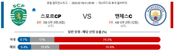 【유럽챔피언스리그】 2월16일 스포르팅 리스본 vs 맨체스터 시티(맨시티)