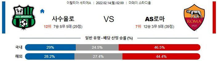 【세리에A】 2월 14일 사수올로 칼초 vs AS 로마사수올로 (리그 12위 / 패승무패패)