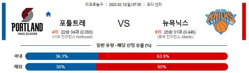 열람중 2월 13일 07:00 NBA분석 포틀랜드 : 뉴욕 2022.02.12 520