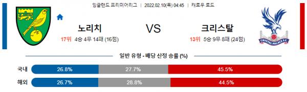 【프리미어리그】 2월 10일 노리치 시티 vs 크리스탈 팰리스 FC