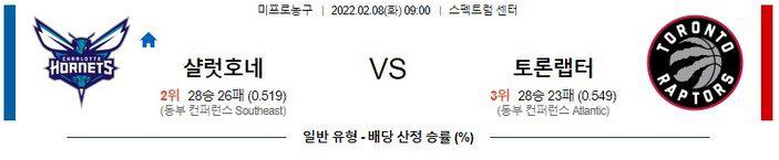 [NBA] 2월 8일 샬럿 호네츠 vs 토론토 랩터스샬럿은 연속경기 일정이였던 직전경기(2/6) 홈에서 마이애미 상대로 86-104 패배를 기록했으며 이전경기(2/5) 홈에서 클리블랜드 상대로 101-102 패배를 기록했다. 4연패 흐름 속에 시즌 28승26패 성적. 마이애미 상대로는 라멜로 볼(12득점)와 테리 로지어(16득점), 마일스 브릿지스(15득점)가 분전했지만 켈리 오브레(9득점)가 승부처에 외곽포(3/15)가 침묵했던 것이 뼈아팠던 경기. 로테이션 수비의 스피드가 떨어지면서 림 방향 도움 수비에 나섰다가 무수히 많은 오픈 3점슛을 두들겨 맞았던 상황. 또한, 고든 헤이워드가 복귀후 2번째 경기에서 22분여 출전 시간 동안 무득점으로 침묵하는 가운데 정상 컨디션이 아니였고 세컨 유닛 싸움에서 부족함이 나타났던 패배의 내용.