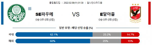 열람중 【클럽월드컵】 2월9일 SE 파우메이라스 vs 알 아흘리 SC 2022.02.08 527