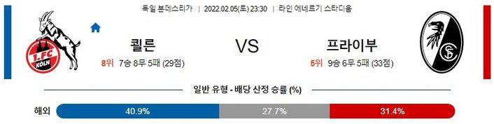 프라이부르크가 근소한 우세에 있다. 최근 흐름이 좋지 않았으나 최근 경기에서 승리하며 어쨌든 분위기를 바꿨다. 공격적인 모습을 보이는 쾰른의 성향은 롱볼을 자주 이용하는 프라이부르크에게는 뒷공간 침투 기회가 될 것이다. 최근 맞대결 5경기에서 5차례나 오버를 충족시켰다. 확실한 자신들만의 공격 무기가 있으므로 서로 물러서지 않는 난타전 양상이 나올 것이다. 스코어는 오버(2.5)가 유력하다.