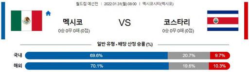 멕시코의 근소 우위다. 그러나 아주 수비적인 코스타리카의 수비벽을 멕시코가 쉽게 뚫기는 어렵다. 멕시코도 공격 마무리에 꽤 고난을 겪을 것이다. 경기 양상은 멕시코가 한 골을 어떻게든 넣고 지키는 양상이 나올 가능성이 높다. 즉 핸디(-1.0)를 가지고 멕시코가 이기지는 못할 것이다. 스코어는 언더 ▼(2.5)가 나올 가능성이 매우 높다. 멕시코 승 / 언더 ▼(2.5)가 유력한 픽이다.
