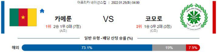 카메룬의 승리를 추천한다. 카메룬은 이번 대회 포함 최근 7경기 6승 1무로 상승 흐름에 있다. 그리고 카메룬은 코모로와의 최근 2019년 3월 승부에서 3-0으로 승리했다. 또한 코모로는 코로나로 결장 선수가 많은 악재가 있다. 핸디캡도 카메룬의 승리를 추천한다. 카메룬은 최근 2019년 승부에서 코모로에 3-0으로 승리한 경험이 있다. 그리고 코모로는 코로나 확진으로 결장 선수가 많은 상황이다. 카메룬이 2골차 이상의 승리를 노릴 수 있는 매치다. 언더오버는 오버를 추천한다. 카메룬은 조별리그 3경기 중 2경기에서 상대팀과 3골 이상을 주고받았다. 그리고 코모로는 최근 가나전에서 5골을 주고받았다. 또한 두 팀은 최근 2019년 승부에서 3골을 주고받았다. 3골 이상이 나올 수 있는 매치다.