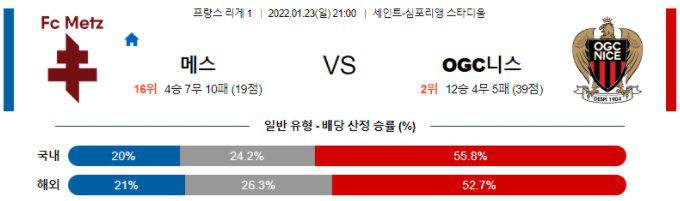 전력 우세를 앞세운 니스가 상대를 몰아칠 준비를 마쳤다. 후방 라인 안정감이 선결된데다, 윗선의 화력 또한 적절하게 묻어 나오며 상대를 수세에 몰고 있다. 메스가 홈 이점을 갖고 난전을 꾀하겠으나 결정력 부재가 발목을 잡고, 후방 기복 역시 만만치 않다. 니스 승, 언더 (2.5점 기준)가 그나마 확률 높은 선택지다.