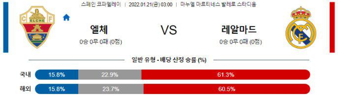 리그 1위를 계속 달리고 있다. 비록 세비야보다 한경기 더 치르기는 했지만, 승점 차가 5점이다. 다만 안첼로티 감독의 로테이션 부재는 걱정되는 부분. 후반기에는 적절한 주전들의 휴식은 필수이다. 하지만 엘체 전은 무난하게 잡아낼 가능성이 높다.오른쪽 공격력이 크게 깎여나갔다. 아센시오(RW / 17경기 5골)가 십자인대 부상 이후 스피드와 신체 능력은 줄었지만, 스탯 자체는 괜찮게 쌓고 있었는데, 이번 경기에서는 결장한다. 따라서 비니시우스(LW / 20경기 12골 4도움)와 벤제마(FW / 20경기 17골 7도움)의 부담이 더욱 커졌다. 하지만 이 둘로도 엘체를 잡는 것은 무난할 것으로 보인다. XG값으로도, 실제 값으로도 원정에서 2골씩은 기록하고 있다. 원정에서 15위 이하 팀을 상대로도 4경기 9골로 괜한 ‘의적’질은 하지 않는다. 다득점은 기대해 볼만 하다.실점 가능성은 적다. 라모스-바란 두 센터백을 내보냈으나, 밀리탕(CB)-알라바(CB) 라인이 더 굳건한 모습을 보이고 있다. 애초에 원정에서도 60%에 육박하는 점유율로 리그 1위에 올라있는 만큼 위험한 상황을 크게 만들지 않을 가능성이 높다. 다만 아직 카르바할(RB)의 공백을 메울 적절한 대체자는 찾지 못했다. 하지만 ‘수비를 안하는 상황을 만들면 된다’ 마인드로 경기에 임하면 무실점 경기도 가능하다.