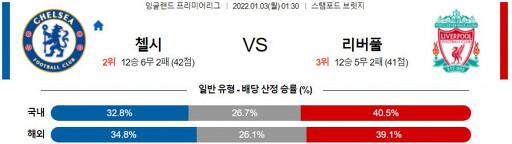 근소 전력 우세를 앞세운 리버풀이 상대를 몰아칠 준비를 마쳤다. 이전 흐림이 저조하지만 공·수 양면에서 수위급의 스쿼드를 갖고 있고, 아프리카 네이션스컵 차출 선수들을 이번 경기서 짜낼 것으로 보인다. 첼시가 난전을 유도하지만 이전 일정서 공격 기복이 심한 탓에 리드를 잡는데 애로가 많다. 리버풀 승, 오버 ▲(2.5점 기준)를 예상하는 쪽이 옳다.
