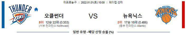 오클라호마에게 닥친 부상+ 코로나 프로토콜 악몽 때문에 역동적인 팀 에너지가 실종된 모습이 나타나고 있는 타이밍 이다. 뉴욕 승리 가능성을 추천 한다.