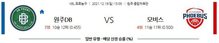 원주 DB는 연속경기 일정이다. 원주 DB는 직전경기(12/18) 홈에서 고양 오리온 상대로 78-58 승리를 기록했으며 이전경기(12/13) 원정에서 한국가스공사 상대로 80-92 패배를 기록했다. 2연패에서 벗어나는 승리가 나왔으며 시즌 10승12패 성적. 외국인 선수를 1명 밖에 가동할수 없었던 고양 오리온 상대로는 조니 오브라이언트(17득점, 13리바운드)와 레나드 프리먼이 골밑을 사수했고 김종규(13득점)의 부활이 나오면서 리바운드 싸움에서 +16개 마진을 기록한 경기. 상무에서 전역한 국가대표 포워드 강상재(5득점, 3어시스트, 12리바운드)의 합류 효과로 높이가 더욱 좋아진 효과가 나타날수 있었던 상황. 또한, 허웅(5득점)의 야투(2/10) 효율성이 떨어졌지만 4쿼터(22-6)에만 15득점을 몰아친 이준희(17득점, 3점슛 3개, 적중률 100%)의 활약으로 상대의 추격 의지를 꺽을수 있었던 승리의 내용.