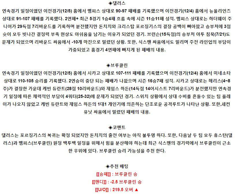 【NBA】12월 8일 댈러스 vs 브루클린 펠리컨스