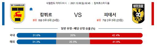전력 우세를 앞세운 비테세가 상대를 몰아칠 준비를 마쳤다. 하지만 최근 빡빡한 일정을 처리하며 전반적인 체력 저하가 일어나고 있고, 공·수 기복이 심하다. 캄뷔르가 오히려 상승세에 힘입어 맞불을 놓아 난전을 유도한다. 무승부, 언더 ▼(2.5점 기준)를 예상하는 쪽이 옳다.