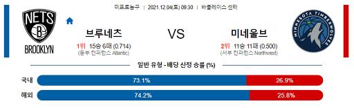 이전경기(12/2) 원정에서 워싱턴 상대로 107-115 패배를 기록했으며 이전경기(11/30) 홈에서 인디애나 상대로 100-98 승리를 기록했다. 2연승이 중단 되는 패배가 나왔으며 시즌 11승11패 성적. 워싱턴 상대로는 칼 앤서니 타운스(34득점, 10리바운드)가 분전했지만 디안젤로 러셀(10득점, 9어시스트)의 야투(3/18) 효율성이 바닥을 쳤고 후반전에 허술한 수비가 나타난 경기. 패트릭 베벌리가 부상으로 결장한 공백이 표시가 났으며 볼 핸들러들의 소홀 했던 볼 관리도 아쉬움으로 남았던 상황. 또한, 세컨 유닛 싸움에서도 밀렸던 패배의 내용.