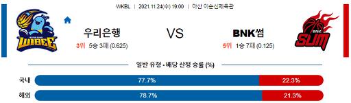 이전경기(11/20) 홈에서 신한은행 상대로 연장전 승부 끝에 75-74 승리를 기록했으며 이전경기(11/18) 원정에서 하나원큐 상대로 62-58 승리를 기록했다. 2연승 흐름 속에 시즌 5승3패 성적. 신한은행 상대로는 박혜진(14득점, 8어시스트, 7리바운드)이 뛰어난 1대1 개인 돌파이후 정확한 점퍼슛을 성공시켰고 김소니아가 23득점을 기록하며 3점슛을 장착한 빅맨의 위력을 보여준 경기. 박혜진이 아이솔레이션을 통해서 많은 찬스를 만들어내자 외곽에서도 찬스가 많이 발생할수 있었고 박지현과 결승 3점슛을 성공시킨 최이샘도 왕성한 활동량을 바탕으로 코트를 휘젓고 다녔던 상황. 다만, 리바운드 싸움에서 -12개 마진으로 밀렸고 베스트5에 대한 의존도가 너무 높은 경기였다는 것은 찜찜한 뒷맛을 남겼다.