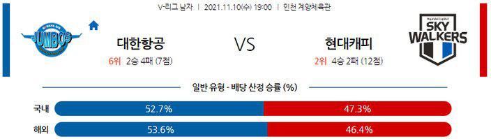 현대캐피탈은 직전경기(11/5) 홈에서 삼성화재 상대로 3-0(25:19, 25:11, 26:24) 승리를 기록했으며 이전경기(10/31) 원정에서 한국전력 상대로 0-3(15:25, 11:25, 15:25) 패배를 기록했다. 시즌 4승2패 성적. 삼성화재 상대로는 베테랑 문성민(16득점, 66.67%)이 높은 공격성공률이 동반 된 공격으로 팀 분위기를 끌어 올렸고 서브(4-2), 블로킹(13-2), 범실(7-24) 싸움에서 모두 우위를 점령한 경기. 허수봉(16득점, 66.67%)도 문성민과 함께 해결사로 나섰으며 박상하(9득점, 80%, 블로킹 5득점), 최민호(6득점, 50%, 블로킹 3득점)는 중앙에서 단단한 벽이 되어준 상황. 또한, 원 포인트 블로커로 투입 된 로날드 히메네즈와 베테랑 여오현 리베로가 시즌 첫 경기를 소화하게 되면서 팀에 새로운 활력소가 되어준 승리의 내용.