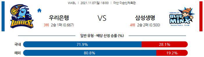 우리은행은 직전경기(11/4) 홈에서 KB스타즈 70-71 패배를 상대로 기록했으며 이전경기(10/30) 원정에서 BNK썸 상대로 88-58 승리를 기록했다. 2연승이 중단 되는 패배가 나왔으며 시즌 2승1패 성적. KB스타즈 상대로는 돌파 또는 3점슛으로 박지수를 외곽으로 끌어낸 김소니아(20득점, 3점슛 4개)의 분전이 나왔지만 이전경기 결장했던 박지현이 1분17초의 출전 시간 밖에 가동될수 없었던 공백이 크게 나타난 경기. 박지수와 골밑 자리 몸싸움을 해주던 김정은이 5반칙 퇴장을 당하자 박지수로 부터 파생되는 상대의 컷인 공격과 킥 아웃 패스에 이은 점퍼슛에 수비가 무너진 상황. 또한, 리바운드 싸움에서 -6개 마진을 기록했고 4쿼터 승부처에 상대의 수비 변화에 대한 대응에도 부족함이 있었던 패배의 내용.