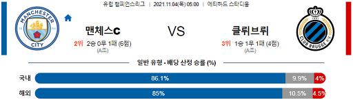 챔피언스리그 11월 4일 05:00 맨체스터 시티 : 클뤼프 브뤼허
