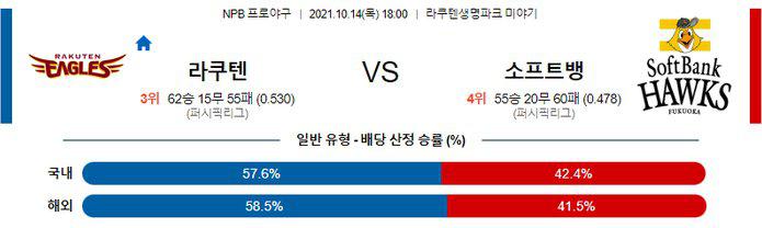 전일 경기에서 라쿠텐은 8회 동점을 만들고 9회 극적인 끝내기 승리를 기록했다. 또한, 후반기 노려한 마운드 운영 능력이 돋보이고 있는 노리모토 다카히로 투수가 우위에 있는 선발 매치업 이라고 생각 된다. 라쿠텐 승리 가능성을 추천 한다.