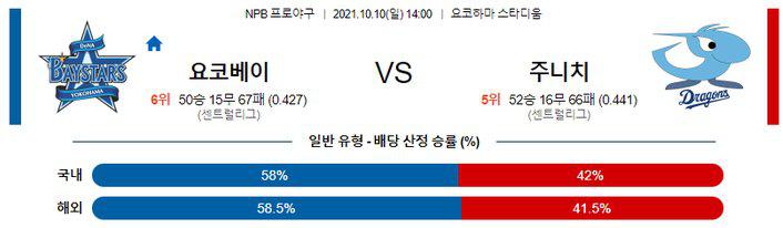 9월19일 주니치 상대로 1실점 완투승을 기록한 이마나가 쇼타 투수는 최근 들어서 탈삼진 능력도 업그레이드 된 모습이며 짠물투구의 연속을 선보이고 있다. 투구내용에 기복이 있는 오가사와라 신노스케 투수 보다 우위에 있는 선발 카드라고 생각 된다. 요코하마 승리 가능성을 추천 한다.