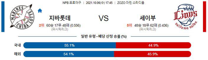 전일 경기 1안타 빈공에 그치며 0-2 패배로 3연패에 빠진 세이부 타선의 침묵이 걱정되는 타이밍. 반면, 지바롯데는 복귀전을 치른 4번 타자 마틴이 안타와 타점을 기록하면서 업그레이드 된 중심타선의 모습이 나타났고 복귀후 2승을 추가하며 3연속 선발승을 기록하게 된 카와무라 토키토 투수는 올시즌 상대전에 강점을 보였다.지바롯데 승리 가능성을 추천 한다.