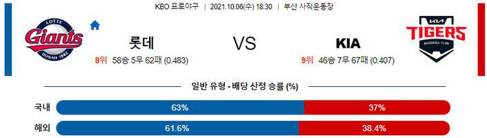 전일 경기에서는 롯데가 13-3 승리를 기록하며 시리즈 기선제압에 성공했다. 5연승 흐름 속에 시즌 58승5무62패. 17안타(2홈런)를 폭발시켰고 불펜의 안정화가 이어지면서 뒷심이 강해진 모습. 반면, 기아는 2연승이 중단 되는 패배가 나왔으며 시즌 46승7무67패 성적. 선발 임기영 투수가 5이닝 3실점을 기록했지만 바통을 이어받은 투수들의 릴레이 실점이 나오면서 차이가 벌어진 경기.