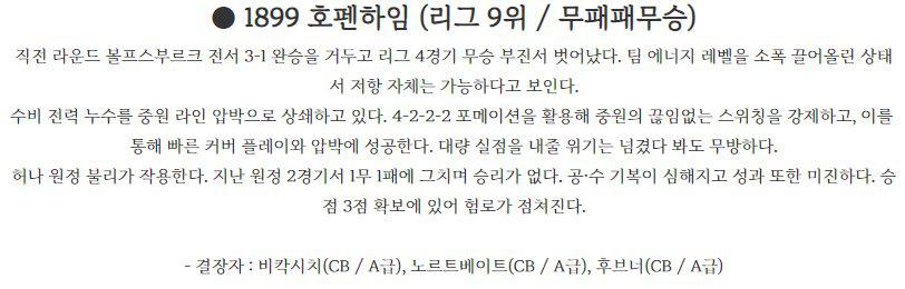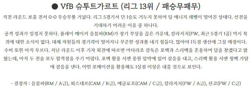 OGC 니스 (리그 4위 / 승승무패승) 직전 라운드 생테티엔 전서 3-0 대승을 따내며 리그 2연패 부진서 벗어났다. 시즌 초반 상승세를 타며 상위권에 올랐다. 선전 이유는 차고 넘친다. 공격 성과가 잘 나는 중이다. 올 시즌 팀에 합류한 델롯(FW, 최근 5경기 2골 1도움)이 무리 없이 퍼포먼스를 높이고 있고, 기존 자원인 구이리(FW, 최근 5…