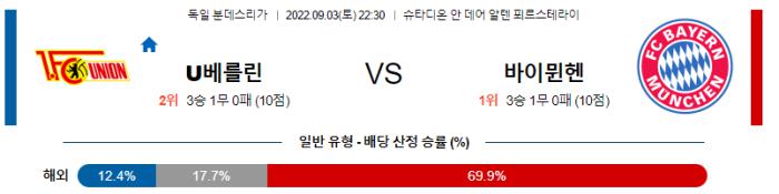 독일 분데스리가 9월 3일 22:30 유니온 베를린 : 바이에른 뮌헨