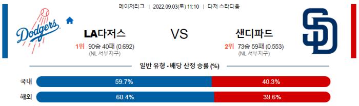 9월 3일 11:10 MLB LA다저스 : 샌디에이고 MLB분석