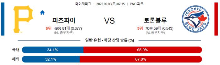 9월 3일 07:35 MLB 피츠버그 : 토론토 MLB분석