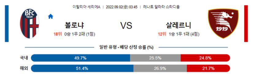 【세리에A】 9월2일 볼로냐 vs 살레르니타나