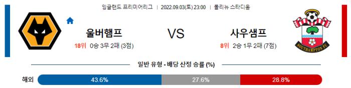 열람중 잉글랜드 프리미어리그 9월 3일 23:00 울버햄튼 : 사우샘프턴 2022.09.02 742