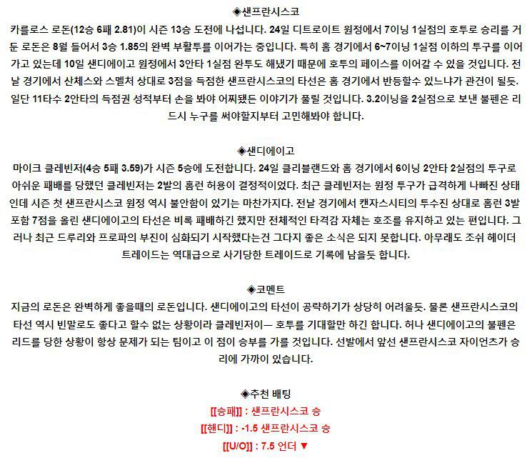◦ 엘지 LG 트윈스 (68승 1무 42패 / 리그 2위) 선발 평가 / ★★★ : 이민호 (20경기 10승 5패 ERA 5.42) 지난 경기에서는 한화를 상대로 5이닝 2실점을 기록하면서 두 자릿 수 승리를 거둔 투수가 될 수 있었다. 잘 던지는 날과 아닌 날의 차이가 큰 선수인데, 지난 경기에서는 계속 커맨드가 흔들리면서 불안했음에도 수비의 도움…