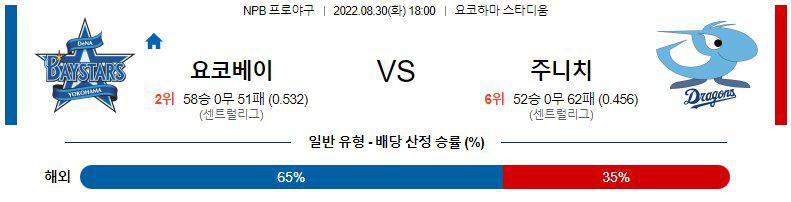 8월30일 요코하마 베이스타스 주니치 드래건스 NPB 일본 야구 경기 분석입니다. 이번경기는 오후 6시에 시작이 되는 경기인데 요코하마의 홈경기가 됩니다. 요코하마 베이스타스 주니치 드래건스 두 팀은 센트럴리그에 속하는 팀들인데, 요코하마는 2위를 기록하고 있고 주니치는 6위를 기록하고 있습니다.