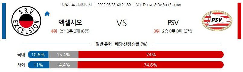엑셀시오르(H+1.0) 승 / 오버(2.5 기준)를 추천한다. 누가 봐도 압도적인 전력 차의 두 팀이다. 다만 레인저스 경기 이후 3일밖에 휴식을 취하지 못한 점과 최근 단조로운 공격으로 생긴 득점력 저하를 근거로 충분히 역배를 노려 볼만 한 경기. 또한 엑셀시오르는 극한의 효율적인 축구로 세련된 측면 공략 패턴과 카르초우치(FW)를 활용한 ‘득점 루트를 ’활용해 충분히 이변을 만들 공산이 크다. 다만 PSV의 챔피언스리그 진출 실패 보복 경기로 진행될 가능성과 맞대결 마다 높은 득점 페이스를 근거로 오버를 필히 겸하자.