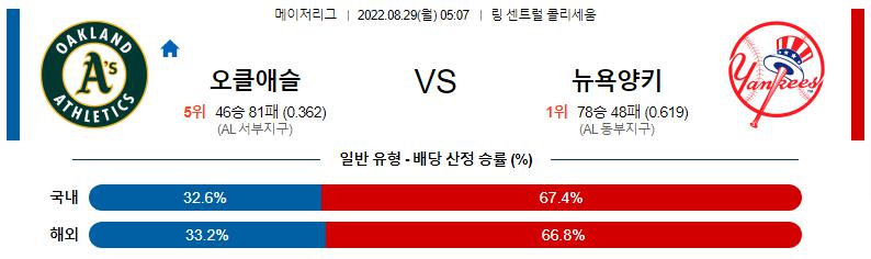 8월 29일 05:07 MLB 오클랜드 : 뉴욕 양키스 MLB분석