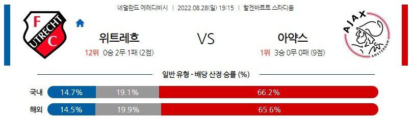 아약스 승 / 오버(2.5 기준)를 추천한다. 누가 봐도 압도적인 전력 차의 두 팀이다. 특히 ‘핵심 수비 ’자고(CB), 호른(CB)을 포함 수비진 붕괴 상태인 위트레흐트 상대 멀티 득점을 기대해도 좋을 것이다. 또한 높은 점유율을 바탕으로 주도권을 주지 않는 ‘공격 플랜에 ’의해 아약스에게 위협을 줄 수 있을지 다소 의문이다. 아약스의 특유의 안정적인 운영을 기대해도 좋을 것. 다소 모헙적인 선택이지만 아약스(H+1.0)까지 노려볼만한 경기. 최근 맞대결 상 오버 전개가 많이 나온걸 근거로 오버를 필히 겸하자.