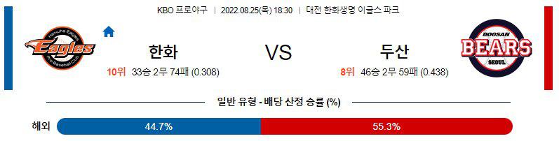 8월25일 KBO 한국 프로야구 한화 이글스 두산 베어스 경기분석입니다. 이번경기는 오후 6시 30분에 시작이 되는 경기인데, 한화 이글스가 홈에서 두산을 맞이하는 경기입니다. 한화는 10위를 기록하고 있고 두산은 8위를 기록하고 있는 팀인데, 한화 이글스 두산 베어스 두 팀의 상대전적에서 두산이 우세합니다.