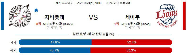 8월24일 NPB 일본 프로야구 지바롯데 마린스 세이부 라이온즈 분석입니다. 오후 6시에 시작이 되는 이번경기는 지바롯데의 홈에서 진행이 됩니다. 지바롯데는 51승57패로 5위를 기록하고 있고 세이부는 60승51패로 1위를 기록하고 있는데, 지바롯데 마린스 세이부 라이온즈 두 팀은 모두 퍼시픽리그에 속해있습니다.