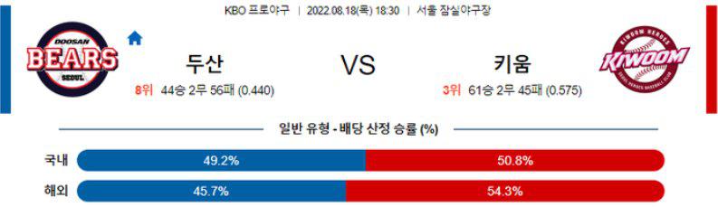 두산의 승리를 점친다. 키움의 마운드 사정을 상당히 비중있게 고려한 선택. 최원태가 퀄리티스타트 비중이 높은 투수가 아니고, 전반적으로 5이닝 정도를 최소 실점으로 막아내는 유형이다. 결국 불펜이 어느 정도 받쳐주어야 하는 상황이라는 것인데, 현재 키움의 불펜 상황은 매우 최악이다. 브랜든이 좌타자 상대로는 상당히 강해 주력 타자들인 이정후, 김혜성 등이 좌타자인 키움 입장에서는 타자들의 활약도 장담하기 어렵다. 다만 두산의 타격 성과도 그리 좋지 못한 것이 사실. 언더가 1순위가 되어도 괜찮을 것이다.