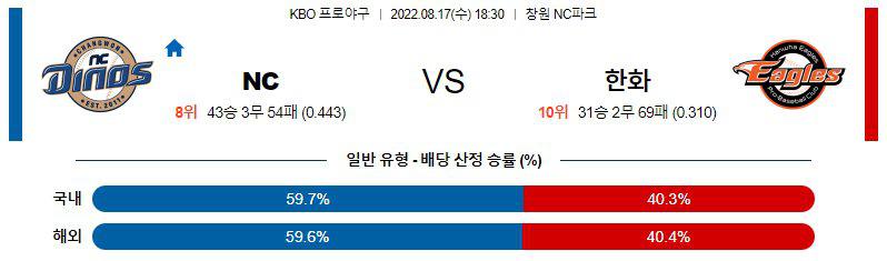 한국프로야구 NC 다이노스 한화 이글스의 경기가 오는 수요일(8/17) 18:30 NC의 홈 구장인 창원NC파크에서 열릴 예정입니다. NC 다이노스 한화 이글스 양 팀 간의 이번 주초 2연전 가운데 마지막으로 펼쳐지는 경기입니다.