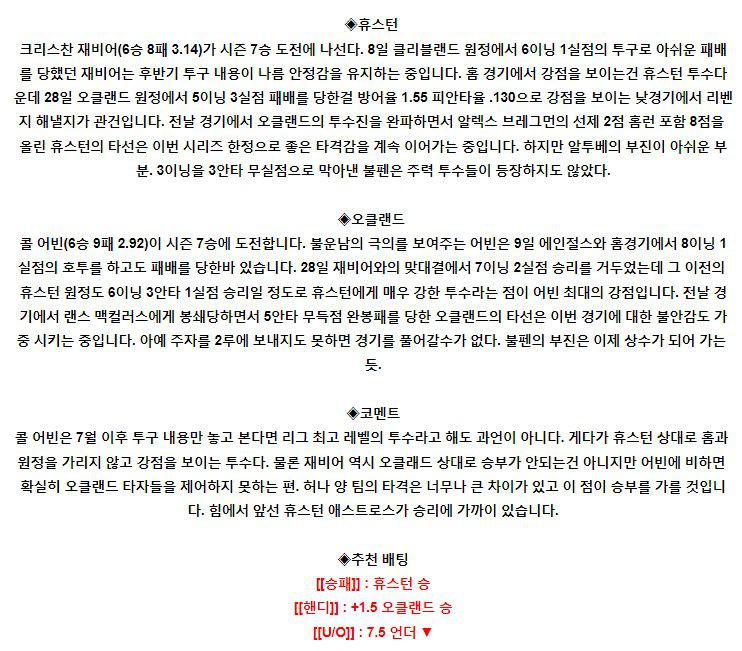 ◈뉴욕 양키스 콜은 최근 두 경기에서 승리를 추가하지 못했다. 와일드카드 획득을 위해 전력을 보강하고 집중력도 끌어올린 시애틀을 연달아 상대했는데 1패를 당했다. 그래도, 최근 등판에서 7이닝을 4피안타 무실점으로 틀어막으며 에이스다운 피칭을 했다. 슬라이더 피안타율이 올라가며 고전했던 후반기였는데 커브가 결정구 역할을 잘해줬다. ◈탬파베이 야브로…