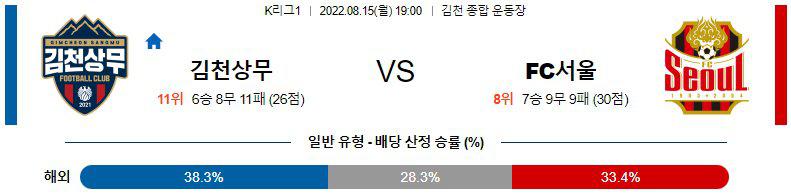 8월15일 K리그1 한국 프로축구 김천 FC 서울 경기가 예정이 되어있습니다. 이번경기는 오후 7시에 시작이 되는 경기로서, 김천 상무가 홈에서 FC 서울을 맞이하게 되는 경기입니다. 김천상무는 10위를 기록하고 있는 팀이고 FC 서울은 8위를 기록하고 있는 팀인데 김천 FC 서울 두 팀의 전력에서는 큰 차이는 없을것으로 보입니다.