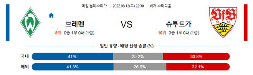 후에 언급하겠으나, 베르더브레멘이 공격적인 기조로 많은 득, 실점을 기록하고 있으므로 다득점 페이스의 오버(2.5 기준) 가능성이 높겠다. 또한 브레멘은 지난 시즌 중도에 데려온 베르너 감독 체제하 매우 좋은 경기력으로 승격했으며, 기세를 이어 원정 개막전 경기에서도 승점을 따냈다. 슈투트가르트가 전방 결정력 문제를 겪고 있으며, 지난 시즌 원정 17경기에서 단 1승밖에 따내지 못했던 점을 고려하면 이번 일정에서 베르더브레멘의 승리가 예상된다.