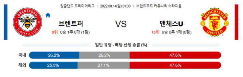 후술하겠으나, 맨유는 개막전 브라이튼과의 홈 경기에서 매우 흔들리는 모습을 보이며 패했다. 특히나 브라이튼의 기동력에 밀리는 모습을 자주 보였다. 이에 자국 언론들과 팀 레전드 출신들의 혹평이 이어지고 있는 상태. 특히나 지난 몇 년 간 문제로 꼽혔던 3선 문제는 해결될 기미가 보이지 않는다. 여기에 브렌트포드도 직전 경기에서 신입생들이 확실하게 팀에 녹아 들지 못하는 모습을 보이며 무승부를 거뒀다. 이번 일정도 양 팀 모두 승리 가능성이 없으므로 무승부를 예상한다. 참고로 주어진 무승부 배당은 3.35배 수준으로 배당 효율 면에서도 나쁘지 않다.