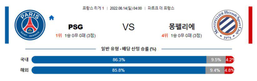 후술하겠지만, PSG는 이번 시즌 새롭게 선임한 갈티에 감독 체제 하 3백을 가동하는데, 안정된 수비 뿐만 아니라 오히려 공격적으로도 좋은 모습을 보이는 중. 공식 2경기에서 9골을 집어넣고 있다. 반면 몽펠리에는 개막전 경기에서 승리를 거두긴 했으나, 수비 불안은 여전한 문제점이다. 메시(FW)와 네이마르(FW)로 이어지는 유기적인 패스 네트워크를 차단하기에는 역부족. PSG의 다득점이 예상되며 핸디캡 승리와 오버(4.5 기준) 모두 가능하겠다.