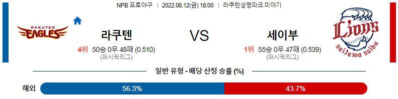 일본프로야구 퍼시픽리그 라쿠텐 골든이글스 세이부 라이온즈의 경기가 오는 금요일(8/12) 18:00 라쿠텐의 홈 구장인 라쿠텐 생명파크 미야기 경기장에서 열릴 예정입니다. 라쿠텐 골든이글스 세이부 라이온즈 양 팀 간의 이번 주말 3연전 가운데 첫번째로 펼쳐지는 경기입니다.